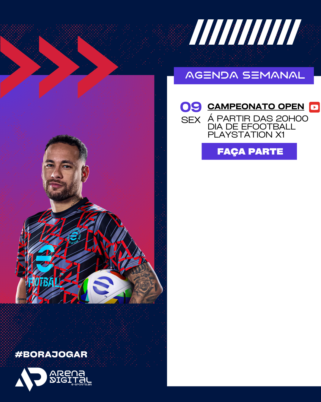 CONTROLE NA MÃO E CORAÇÃO NA PARTIDA! Você tá pronto pra essa sexta-feira eletrizante? E aí, família gamer! A Arena Digital Brasil preparou mais uma semana cheia de emoção no mundo do futebol virtual, e você não pode ficar de fora!