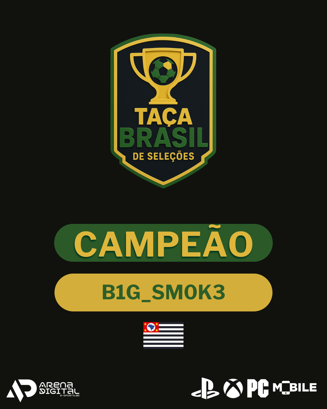 A Arena Digital Brasil agradece a todos os guerreiros que deram seu sangue em campo virtual e transformaram esta Taça Brasil de Seleções em um espetáculo inesquecível. E um salve gigante aos nossos parceiros oficiais que tornam estas competições possíveis: MyMax Brasil, Draxen Brasil, Terrawind, Avis Budget e Labor Smart – vocês são a base que sustenta o crescimento do cenário competitivo nacional.