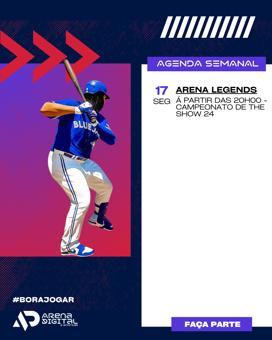 A semana começa com tudo na Arena Legends, o campeonato de beisebol virtual que promete colocar à prova a estratégia e paciência dos competidores. The Show 24 abre os trabalhos com todas as equipes do jogo disponíveis para consagrar a melhor equipe virtual do Brasil. Preparem-se para uma verdadeira guerra de nervos onde cada arremesso, cada rebatida e cada jogada defensiva serão decisivos para a conquista do título.